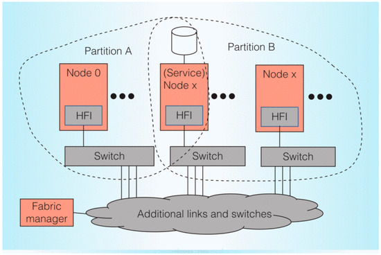 Because many network features are integrated into the CPU, Omni-Path can bring ultra-high processor interconnection performance for isomorphic supercomputing with specific Xeon processors. The main design objectives of OPA include reducing interconnection cost and power consumption, improving interconnection density, improving node bandwidth, reducing communication delay, improving MPI message rate, improving scalability, and improving system error correction capability and quality of service. As shown in Figure 4 (reproduced with permission from [7]), OPA components mainly include the network card, switch, and network manager. The network card is used to connect computing/service/management nodes to the network. Nodes, including service nodes, may be assigned to one or more partitions. The switch constructs several nodes into a network through the network topology. The network manager is used to centrally manage and monitor the network. The fabric is scalable, based on interconnected switch components, and is centrally managed. The OPA does not have too much offloading implementation, and a lot of work is shared by the processor kernel, which is different from the design concept of InfiniBand.