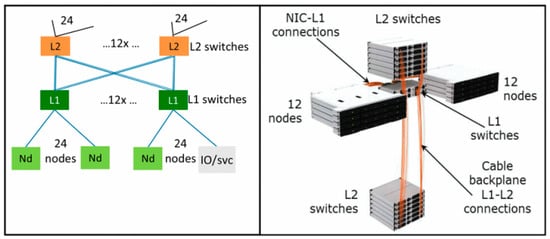 BXI is different from InfiniBand’s proprietary protocol implementation and is a reliable, “order-preserving” network architecture. BXI can expand up to 64 K nodes; support multiple network topologies, such as fat-trees, torus, butterfly, etc.; support adaptive routing and flexible routing algorithm optimization; and provide deadlock-avoidance and load-balancing mechanisms. Figure 8 (reproduced with permission from [15]) is a schematic diagram of the network logic configuration and physical layout of the BXI architecture configured as a two-level fat-tree.