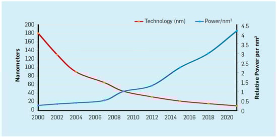 Accompanying Moore’s Law was a projection made by Robert Dennard called “Dennard Scaling” [48], which states that, as transistor density increases, power consumption per transistor will drop, so the power per mm2 of silicon will be near constant. Since the computational capability of a mm2 of silicon increased with each new generation of technology, computers would become more energy efficient. Dennard Scaling began to slow significantly in 2007 and faded to almost nothing by 2012, as shown in Figure 9 (reproduced with permission from [49]). Since 2007, this scaling effect has slowed down until 2012 when the power consumption per square nanometer began to rise rapidly, resulting in an increase in energy consumption and a decrease in efficiency [50,51,52]. Power consumption has become a major challenge for chip design.