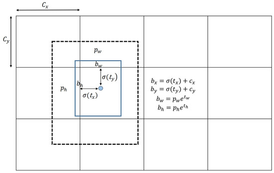 In order to solve the problem of low detection accuracy of the YOLOv1, YOLOv2 [23] adds BN (batch normalization) after each convolutional layer, applies multi-anchor training methods to increase the number of detectable objects. Moreover, YOLOv2 is fine-tuned on a pre-trained CNN using a high-resolution dataset. YOLOv3 [24] introduces a residual module and nine anchor boxes for detection, which improves the detection accuracy of small targets while ensuring the detection speed. Specifically, YOLOv3 first transforms the input image to a size of N × N (N is 416 by default), and uses Darknet-53 to extract image features. Then, the transformed image is divided into S × S equal-sized grids (S is 13, 26, and 52, respectively, representing three scales), and the network randomly selects a new image size every 10 batches. For each grid, three anchor boxes generate three bounding boxes, respectively. as shown in Figure 1, for each grid, the convolutional neural network predicts 4 values to represent each bounding box, denoted as , ie the coordinates and the width w and height h of the object. If the object center is offset from the upper left corner of the image in the grid, the offset is assumed to be , the height and width of the anchor box are recorded as and . The bounding box is corrected as: