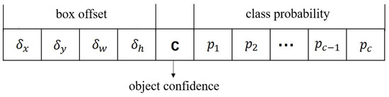 One-stage vehicle detection can be viewed as a regression problem and generates tensors to predict the output. As shown in Figure 2, the width and height of the output tensor depend on the number of grids of the input image, and the depth depends on the number of anchor boxes per grid. The prediction output definition of each anchor box is shown in Figure 3. The box offset of the model is defined by the position and scale between the bounding box and the matching anchor box , where . The scale parameter describes the scale difference between the prediction box and the anchor box: