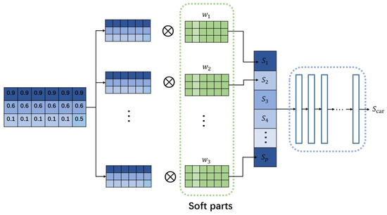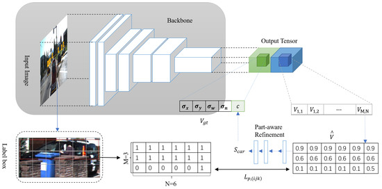 We first introduce the concept of a part confidence map [33,34] represented by V, which is an grid (generated by the sigmoid function) in the range [0, 1], as shown in Figure 4. The ground truth of the part confidence map is generated as follows. We identify a bounding box for the overall vehicle and divide it into an grid. The YOLO algorithm determines whether it is an object box by the confidence of several prediction boxes. Our method aims to convert the confidence of each prediction box from a single value to a confidence map, on this basis, the confidence of the occluded part can be weakened to improve the vehicle prediction box. For each cell , , , set if the cell area occupied by the vehicle exceeds times. In our experiments, we set , and .