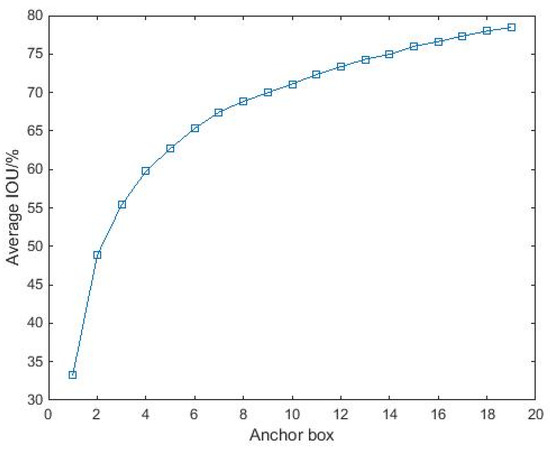 As shown in Figure 7, ideally, the larger the number of anchor boxes, the better. However, the number of anchor boxes affects the execution efficiency of the algorithm. We observed that when the number of anchor boxes reaches 15, we will continue to increase the number of anchor boxes. The improvement of the average intersection ratio is not obvious, so the average intersection ratio and the number of anchor boxes are weighed, and 15 anchor boxes are selected.