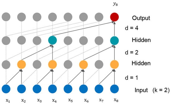 We illustrate the structure of causal dilated convolutions with an example, as shown in Figure 1, which depicts dilated causal convolutions with dilation coefficients d of 1, 2, and 4 and convolution kernel k of size 2. The input sequence is and the result of each layer at time t = 8 depends on the value before time t = 8 of the previous layer. Each layer extracts the information of the previous layer, all in the form of interval sampling. The layer-by-layer expansion coefficient increases exponentially by 2, and finally, can extract the information of the sequence. TCN can obtain a large receptive field with fewer layers. In theory, causal dilated convolutions can accept data at any time step as input.