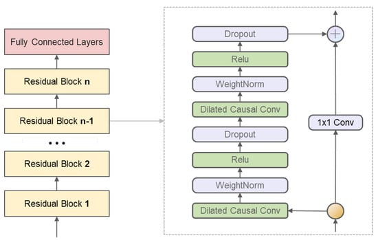 The temporal convolutional network is a new type of time series forecasting algorithm. The TCN architecture includes dilated causal convolution and residual modules [48]. Compared with LSTM and GRU, TCN has the advantages of low memory occupation, stable gradient, good parallelism, and flexible receptive field.