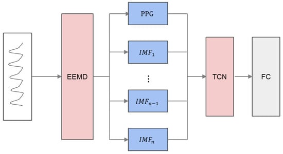 The method proposed in this study is based on the frequency decomposition algorithm EEMD and TCN model. Figure 3 shows the method proposed in this paper. First, we decompose the first PPG signal segment into n IMF by EEMD, construct a potential feature set, and then input each group of subsequences and the original PPG signal segment into the TCN prediction model as channels, so that the model can extract more PPG information. The feature set constructed in theory is dynamic, and we can determine which IMF and original PPG are selected to constitute the feature set through experiments, to minimize the error of the model.