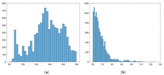 Histogram of blood pressure distribution: (a) is the data distribution of SBP; (b) is the data distribution of DBP.