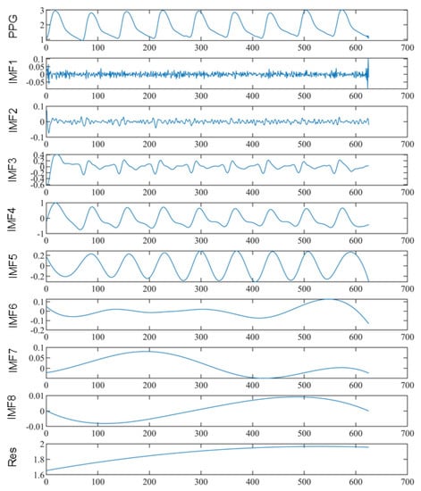 Firstly, the PPG signal segment is decomposed by the EEMD method, and 8 groups of IMF and a group of residual components can be obtained by sequential separation. The decomposition result is shown in Figure 5: