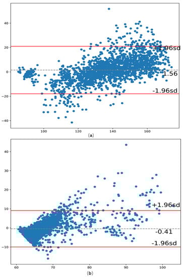 The Bland–Altman diagram is a key method to evaluate the consistency between two measurement methods. The 95% confidence interval boundary is set to [mean-1.96sd, mean + 1.96sd], where mean here represents the mean of the difference between the estimated value and the true value, and sd represents the standard deviation of the difference between the true value and the estimated value. The results of the consistency analysis of SBP and DBP are shown in Figure 6, the average errors between the estimated and target values are −0.48 mmHg and −0.41 mmHg, respectively.