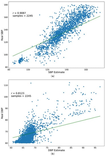 In the experiment, to study the correlation between the estimated values of SBP and DBP and the true values of the test set, the author carried out the Bland–Altman consistency test and scatter plot analysis for the estimated values.