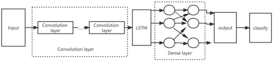 CLDNN (convolutional, long short-term memory, fully connected deep neural networks) networks usually connect several layers of CNN after the input layer to reduce the frequency domain change; the output of the CNN layer enters several layers of LSTM to reduce the time domain change, and the output of the last layer of LSTM enters the fully connected DNN layer, as shown in Figure 1. The network structure was first proposed by Sainath et al. [12] in 2015 and is now widely used in the field of speech recognition.