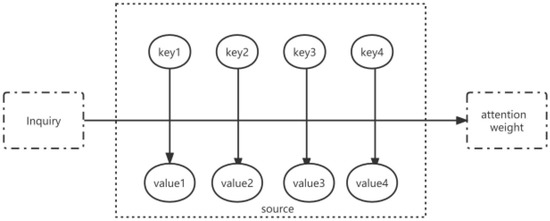 Imagine that the constituent elements in the source in Figure 2 are composed of a series of <keyValue> data pairs. At this time, for an element query in the target, the weight coefficient of the value corresponding to each key is obtained by calculating the similarity or correlation between the query and each key, and then the value is weighted and summed to obtain the final value of attention [19]. Therefore, in essence, the attention mechanism is used to weight the sum of the value of the element in the source, and the query and key are used to calculate the weight coefficient of the corresponding value.