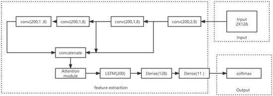 Deep learning has the outstanding advantage of being able to automatically perform feature extraction on signals and has been widely used in the field of modulated signal identification in recent years. Ref. [3] carried out a study on machine learning based on convolutional neural networks for radio signal modulation. Ref. [4], on the other hand, investigated the deep structure of modulation recognition and obtained an improvement in the effect. Ref. [5] discussed the advantages of radio signal classification based on aerial deep learning compared to traditional algorithms. Ref. [6] trained different neural networks, such as baseline neural network and residual neural network, and obtained relatively high recognition rates. Ref. [7] optimized the convolutional network model with three convolutional layers and one LSTM layer, and preprocessed the higher order accumulation of each signal and obtained good results. Ref. [8] directly used LSTM networks without preprocessing the signals, and the overall results were good, but the results were poor at low signal-to-noise ratios because the LSTM layers would lose some timing information. Ref. [9] used a one-dimensional convolutional long short-term deep neural network (1CLDNN) model combined with a centerloss loss function to classify the radiation source signal, and the signal recognition accuracy was improved compared with the convolutional neural network (CNN) model, but the recognition accuracy was limited in the low SNR environment; ref. [10] proposed to improve the CLDNN model by combining the Bi-GRU [11] by replacing the long short-term memory (LSTM) layer in the CLDNN network with a bidirectional structure, which improves the recognition accuracy and recognition speed, but still does not work well for more complex low SNR signals.