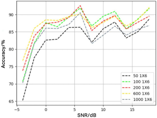 This paper adopts the international general dataset RML201610A [22]. The dataset contains 8 types of digital modulation signals (BPSK, 8PSK, CPFSK, GFSK, pam4, qam16, QAM64, and QPSK) and 3 types of analog modulation signals (AM-DSB, am-SSB, WBFM), a total of 11 different types of modulation signals. The signal-to-noise ratio of 11 signals is distributed in the range of −20–18 db, with an interval of 2 dB. Under different signal-to-noise ratios, each signal is composed of two IQ channels, with 128 sampling points. In addition, to be close to the real environment, this dataset adds influencing factors, such as center frequency shift, fading exit, and additive Gaussian white noise to various signals.