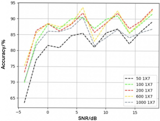 By comparing the recognition rates of 200 convolution kernels in 1 × 6, 1 × 7, and 1 × 8, we finally choose 200 1 × 8 convolution kernels as the optimal case.