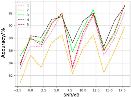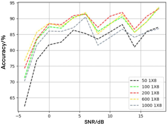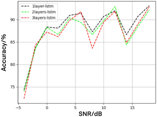 Finally, the results are shown in Figure 8 and Table 2. With the increase in the number of LSTM layers, the number of parameters that need to be trained in the network also increases greatly. At the same time, the training of the model increases correspondingly with the classification time on the test set, but the classification performance is declining. The results in Table 2 show that the average recognition rate and maximum recognition rate of the network model with one layer of LSTM are higher than those of multiple layers in a high signal-to-noise ratio. It can be seen that the time-series characteristics of the signal extracted by one layer of LSTM can meet the requirements of classification.