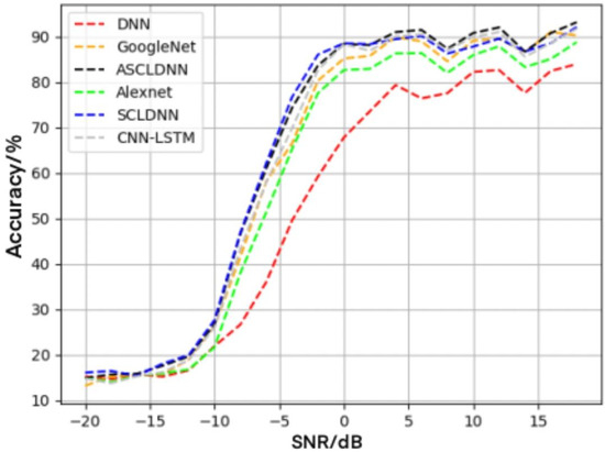 As shown in Figure 9, even compared with the current newer model, the recognition rate of the model proposed in this paper is significantly improved in the range of −6 dB to 0 dB, and the recognition rate is relatively high in the case of the high signal-to-noise ratio. The following table analyzes and compares the specific performance data of ASCLDNN with other models.