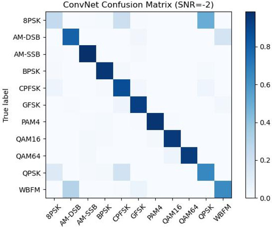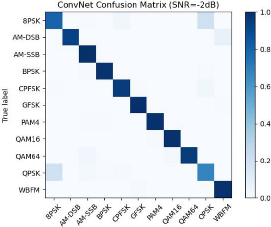Figure 10 and Figure 11 are the confusion matrix diagrams of CLDNN and ASCLDNN models when the signal-to-noise ratio is −2 dB, which can intuitively reflect the recognition effect of the model on 11 signal modulation modes. According to the previous experimental results, when the signal-to-noise ratio is greater than −2 dB, the recognition rate of various models for various signals fluctuates, but it is basically stable in a certain range, so we choose the signal-to-noise ratio of −2 dB for analysis. It can be seen from the figure that the CLDNN model mistakenly identifies part of WBFM as AM-DSB and confuses the part of 8PSK and QPSK, resulting in a low recognition rate of 8PSK, WBFM, and QPSK signals. The ASCLDNN model does not recognize part of WBFM as AM-DSB and reduces the confusion of the 8PSK and QPSK signal modulation methods. It can be predicted that in the future, the focus of improving the network recognition rate is to continue to reduce the confusion of 8PSK and QPSK modulation methods.