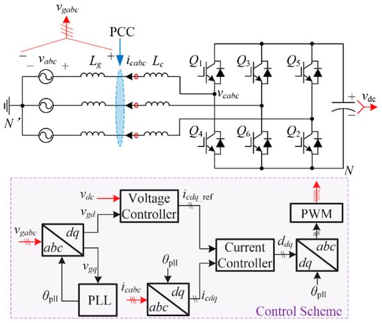 As shown in Figure 1, the DSTATCOM system consists of a three-phase grid-connected inverter, three filter inductors Lc, and a DC capacitor. Notably, three-phase quantities are differentiated by the subscripts a, b, and c. The DSTATCOM is connected through the PCC to a weak grid, which is modeled as a series connection of the grid inductors Lg and an ideal three-phase voltage source vabc. To yield the worst stability case, equivalent series resistors (ESRs) of inductors are all ignored. Figure 1 presents the control scheme of DSTATCOMs, which is implemented in the synchronous dq0-frame, where a standard cosine signal in phase A will be transformed into a constant in the d-axis. Correspondingly, d-axis or q-axis quantities are denoted by the subscript d or q, respectively. In additional, the subscript “ref” designates the reference notation. As shown, the control scheme features an outer voltage controller and an inner current controller. In Figure 1, a phase-lock loop (PLL) captures the phase of PCC voltages vgabc for abc/dq and dq/abc transformations. It is worth mentioning that the voltage control not only regulates the DC-link voltage vdc but also offers voltage droop control by linking the PCC voltage magnitude Vgd to the q-axis current reference icq_ref. Subsequently, the output signals of the voltage controller are sent to the current controllers as the d- and q-axes’ current references. In what follows, the current controller generates duty cycles for the PWM block that drives semiconductor switches.