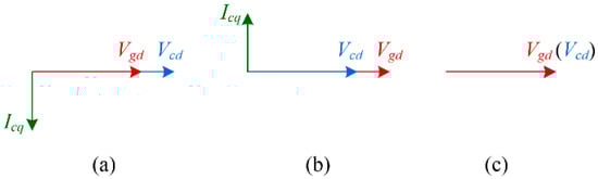 Figure 2 provides the vector diagrams of DSTATCOMs. In most scenarios, DSTATCOMs supply (inductive) reactive power to power grids, where the reactive current Icq lags the PCC voltage Vgd by 90 degrees. However, DSTATCOMs may also absorb reactive power by making Icq lead Vcd. For illustration, Figure 2a shows a condition where the converter voltage magnitude Vcd is greater than Vgd (i.e., Vcd > Vgd). In this case, DSTATCOMs act as capacitors and inject reactive power. Alternatively, DSTATCOMs serve as inductors and absorb reactive power from the grid if Vcd < Vgd, as shown in Figure 2b. Figure 2c demonstrates a case where no exchange of reactive power is expected, as Vcd and Vgd are identical.