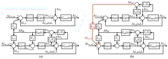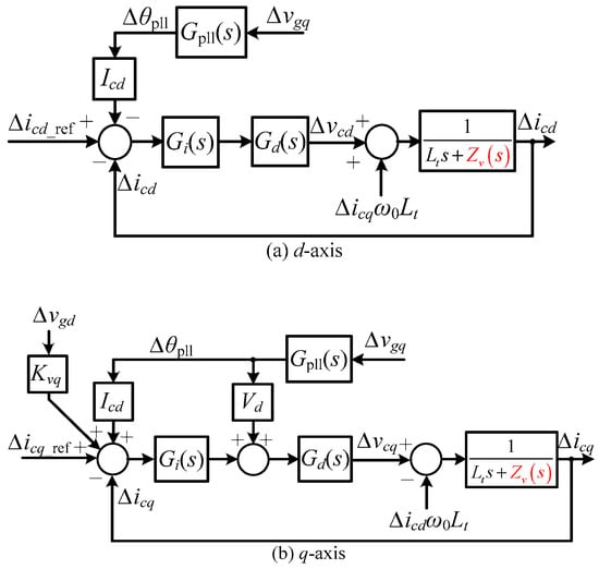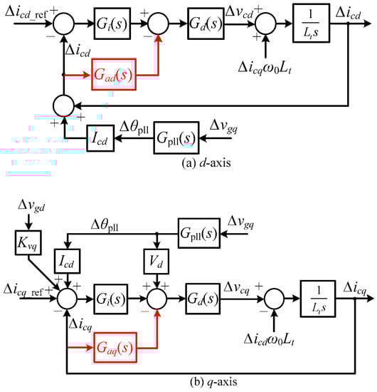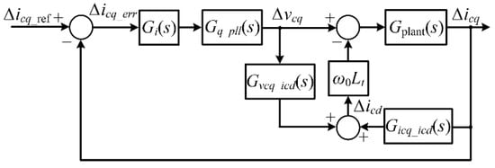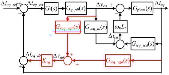 For illustration, the q-axis current control with voltage droop is redrawn as Figure 5, where the modifications introduced by voltage droop are highlighted. In Figure 5, ∆icq_dr models the effect of ∆vgd on the q-axis current control. In this case, the sum of ∆icq_dr and ∆icq should be regarded as the output of the q-axis control loop. Correspondingly, the loop gain of the q-axis control with voltage droop is derived as