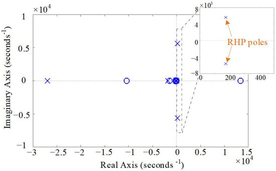 Similarly, the other three matrix elements in (6) can also be derived. However, the detailed deriving procedures are excluded here due to page limits. For demonstration, their pole-zero maps without and with voltage droop are shown in Figure 8 and Figure 9, respectively. The subscript “dr” denotes the matrix elements in (6) that are modified by voltage droop. Clearly, there is no RHP pole of the transfer functions without voltage droop. In contrast, the presence of RHP poles in Figure 9 confirms that the employment of voltage droop causes stability problems. This is as expected by noting the strong coupling effects between the d- and q-axes.
