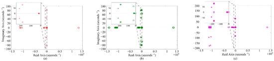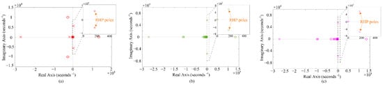 Pole-zero maps of transfer functions without voltage droop: (a) Gicd_cl(s); (b) Gicdref_icq(s); (c) Gicqref_icd(s).