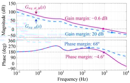 To investigate the root cause of stability problems, Figure 10 compares the Bode plots of Gicq_ol(s) and Gicq_cl_dr(s). As seen, the considerable magnitude amplification, together with the phase decrease of Gicq_cl_dr(s), can destabilize DSTATCOM systems. The mechanism behind instabilities can be found in Figure 5, where two additional loops from ∆icq and ∆vcq to ∆icq_dr are introduced due to voltage droop. The transfer functions from ∆icq and ∆vcq to ∆icq_dr can be obtained from Figure 5 as