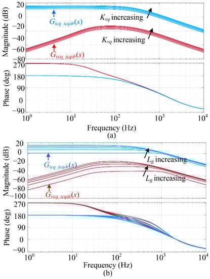 The magnitudes of the two transfer functions Gicq_icqdr(s) and Gvcq_icqdr(s) are both proportionally related to the droop coefficient Kvq. In addition, according to (20) and (21), they are also positively related to the grid inductance Lg. Figure 11 shows the Bode plots of Gicq_icqdr(s) and Gvcq_icqdr(s) with various Kvq and Lg. In Figure 11a, Kvq is swept from 1.2 to 2 with a step size of 0.2. In Figure 11b, Lg is gradually changed from 2 mH to 10 mH. Figure 11 implies that Gicq_icqdr(s) should be responsible for the magnitude amplification of Gicq_cl_dr(s). Moreover, the increment in Kvq or Lg further amplifies the magnitude of Gicq_icqdr(s), which means that ∆icq_dr becomes more sensitive to ∆icq. This tends to degrade the stability of DSTATCOM systems.