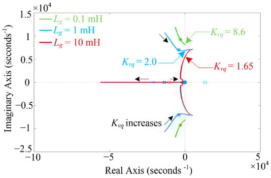 Furthermore, the influences of Kvq and Lg are visualized by the root loci of Gicq_cl_dr(s) shown in Figure 12, where Kvq ranges from 0 to 10. Figure 12 demonstrates the negative effect of voltage droop on system stability. For a fixed Lg, the closed-loop poles are gradually shifted rightwards as Kvq increases. Furthermore, the increment in Lg will lower the critical value of Kvq. These observations can be explained by the fact that the negative effect of voltage droop is essentially caused by the multiplication of Kvq and a gain of Lg/Lt (see Figure 3b). The above analysis discloses the necessity of stability improvement for DSTATCOMs under weak grid conditions.