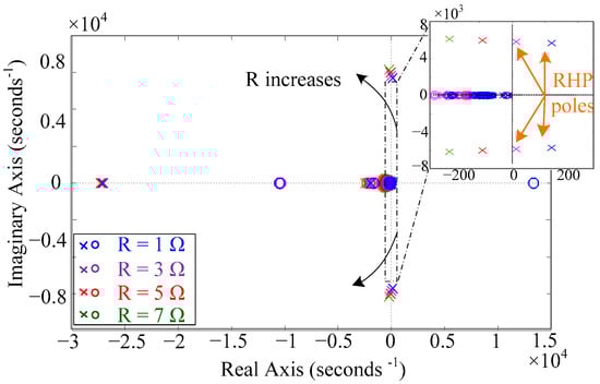The effectiveness of R is evaluated by the pole-zero maps of Gicq_cl_dr(s) shown in Figure 14. As seen, the stability of DSTATCOMs can be improved by increasing R. Specifically, RHP poles disappear when R is greater than or equal to 5 Ω, indicating that DSTATCOM systems are stabilized. This agrees well with (31).