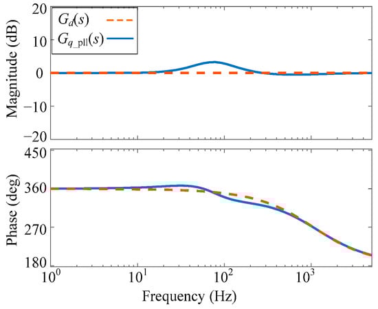 When the proposed controller is designed as (32) and (33), the systems in Figure 15 and Figure 16 will be identical. However, note that the inverse transfer functions of time delay Gd(s) and Gq_pll(s) are not necessarily available in practice. Since Gd(s) and Gq_pll(s) both exhibit a unity gain in the low-frequency band, as proved by Figure 17, Gad(s) and Gaq(s) can be designed as pure gains to approximate the virtual resistance behavior, i.e.,