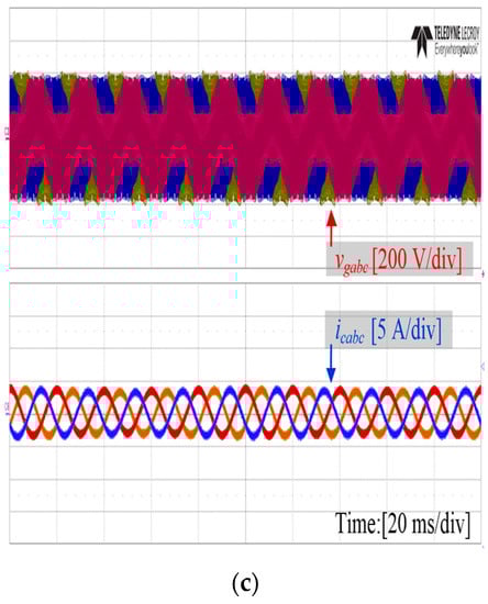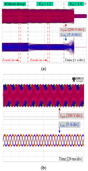 Figure 18 shows the experimental waveforms of the DSTATCOMs without and with voltage droop (of different droop coefficients). Clearly, the DSTATCOM system is stable without voltage droop, as proved by Figure 18b. As seen in Figure 18c, when the voltage droop with Kvq = 1.2 is applied, the inductor currents icabc and PCC voltages vgabc remain stable shortly. However, when Kvq is increased to 1.8, the currents icabc diverge rapidly, indicating that instability occurs. This is as expected, since Kvq exceeds the upper limit 1.65 according to the previous analysis.