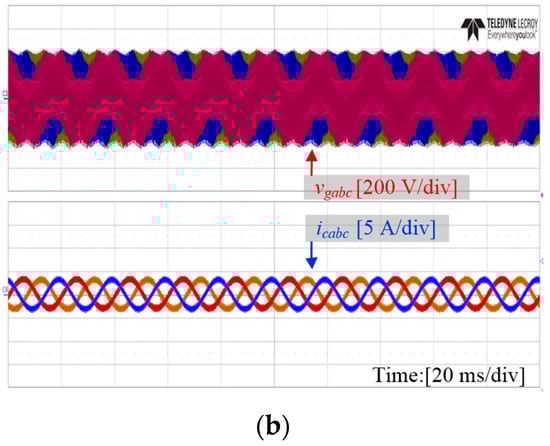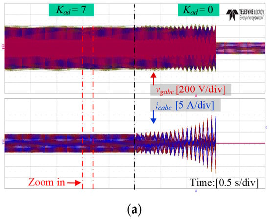 When Kvq is designed as 1.8, the stability problems of STATCOMs can be successfully addressed by the proposed control scheme, as demonstrated in Figure 19. With Kad = 7, the PCC voltages vgabc and the converter currents icabc are all stable, as shown in Figure 19b. When the proposed controller is disabled, i.e., Kad = 0, the system becomes unstable again. These experimental results demonstrate the effectiveness of the proposed control scheme in terms of stability improvement.