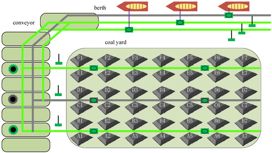 The actual coal terminal yard distribution and coal transfer process are shown in Figure 1. There are six rows of coal piles, from A to F, in the coal yard, each row has seven coal piles, for a total of 42 coal piles are arranged in lattice form, which are A1 to F7 in the figure. There are three rows of reclaiming lines in the terminal, where each reclaiming line is located in the middle of the two rows of coal piles, and the reclaimer on the reclaiming line is responsible for grabbing the coal from the coal piles to the conveyor belt. The three ship loaders are responsible for transporting the coal from the storage yard. The coal near the berth is transferred into the hold of the moored vessel. The three berths are arranged in sequence, and each berth docks a corresponding ship according to the plan. Each ship to be loaded with coal has several cabins, and each cabin corresponds to the corresponding coal order demand.