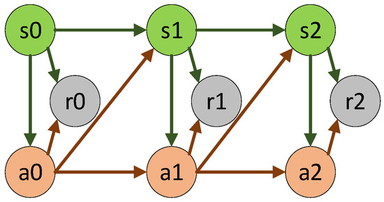 The Markov decision process (MDP) is a discrete-time stochastic process used to model decisions. It can be used to solve problems that learn interactively from the environment and achieve some goals. In MDP, it is the agent that learns, and the other things it interacts with are called the environment. The mathematical representation of the Markov decision process is a quintuple (S, A, P, R, γ), where S is the set of states (state space), A is the set of actions (action space), P is the state transition probability, R is the set of instantaneous rewards, and γ is the discount factor to reflect the loss coefficient of each downward propagation step of the instantaneous reward. As shown in Figure 2, the execution process of Markov is as follows: the initial state of the agent is s0. First, an action a0 needs to be selected from the action set to execute. After execution, the action a0 and the instantaneous reward r0 are obtained, and the agent randomly transitions to the next state s1 according to P probability.