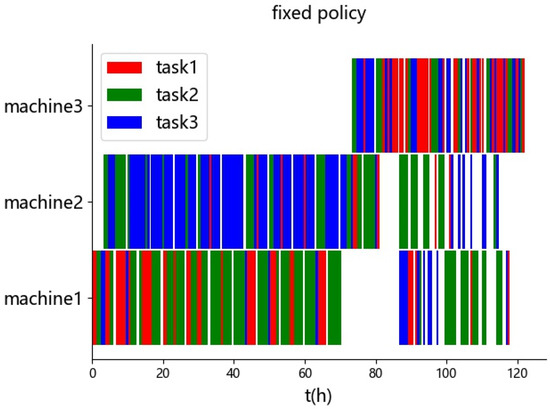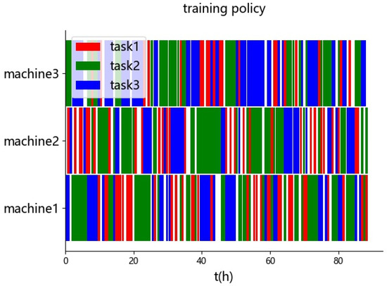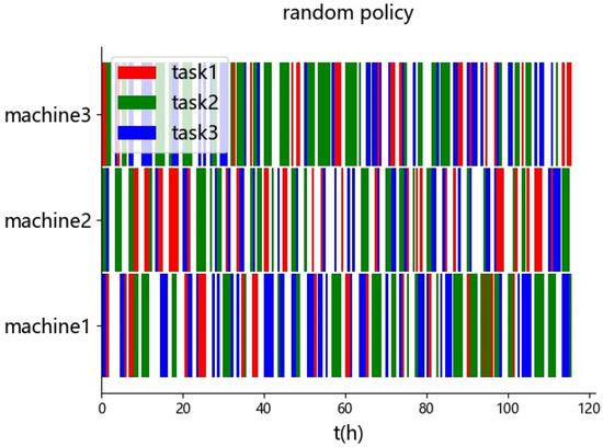 In the validation phase, this study compared three different scheduling strategies: (1) the artificially selected production scheduling strategy, which simulates the artificial plan, which is shown as Figure 7; (2) the random scheduling strategy, which simulates the machine automatically selecting the corresponding process to complete the task (this strategy is equivalent to the initial strategy before the neural network is trained), which is shown as Figure 8; (3) the post-training policy, which is the policy obtained after training the model with the methods used in the study, which is shown as Figure 9. In this study, the terminal loading system used three strategies to complete a set of randomly generated task order sequences, obtaining three sets of data. The validity of the training results and the superiority of the intelligent system over the artificial system were verified by comparing the three sets of data.