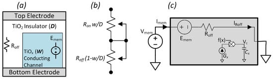 Memristors are two-terminal devices that can hold their present resistance state until sufficient external bias is applied to change their conductivity. This study uses a TiO2 based voltage controlled ionic drift memristor model, shown in Figure 2a. The TiO2 based non-linear ionic drift memristor model was proposed by Strukov et al. in 2008 []. Although the model has lower accuracy, it has been widely used in simulations and comparison studies by Chua et al. for designing networks with memristive bridge synapses and others [,,,,,]. The model is not purely mathematical, has explicit I-V relationship, includes non-linearity, and has normalized state variable .