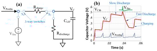 The post-synaptic neuron used in the biphasic spiking neural network in Figure 1 implements leaky integrate-and-fire (LIF) behavior. The LIF circuit is often realized using operational amplifiers and MOSFETS [,,]. This work uses an equivalent behavioral model designed in Verilog-A to capture critical aspects of circuit operation (Figure 3a). The LIF circuit fires a bi-directional biphasic spike (toward the dendritic and axonic synapses) when a certain threshold is reached, as in Figure 3b. The schematic depiction of the LIF circuit is presented in Figure 3a. The input of the circuit VPostIn is the node connected to the output of all the memristors in the fully connected network presented in Figure 1. VPostIn depends on the conductivity of the memristors in the network and the spike timing of the pre-synaptic afferent neurons.