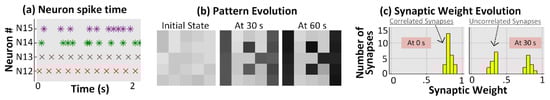 Before simulating situations in which neuron death occurs, typical network operation is described in this section. Pre-synaptic afferent neurons (N1 to N25 or 100) in the following simulations fire 10 ms biphasic spikes at an average rate of 5 Hz for the 100 s transient simulation time. Figure 4a shows the time at which spikes arrive for a 25-pixel pattern ‘B’. Afferents that are part of the pattern such as N12 and N13 fire mutually correlated spikes at regular 200 ms intervals. Although the firing interval is regular for these participating neurons, the exact position of the spike within the 200 ms window is chosen randomly. Non-participating afferents fire uncorrelated (random) spikes with Poisson distributed inter-spike intervals (ISIs), as shown by N14 and N15 in Figure 4a [,]. Lighter color pixels in Figure 4b (at 60 s) are participating neurons and darker ones are non-participating neurons firing uncorrelated spikes. Figure 4b shows the synaptic weight evolution of all the memristors (M1 to M25) as the network tries to learn the 25-pixel letter ‘B’. Initially, all the weights are set in a highly conductive state. After 30 s of the training, the network was able to depress most of the uncorrelated neurons by decreasing the conductivity of their corresponding memristors, and the desired pattern is very recognizable. At 60 s, the network is in a stable state with post-synaptic neuron firing at a constant rate. Figure 4c shows the synaptic weight distribution of the memristors and corresponding decrease in weight of uncorrelated synapses during learning. More about the network behavior in absence of neuron death can be found in refs. [,].