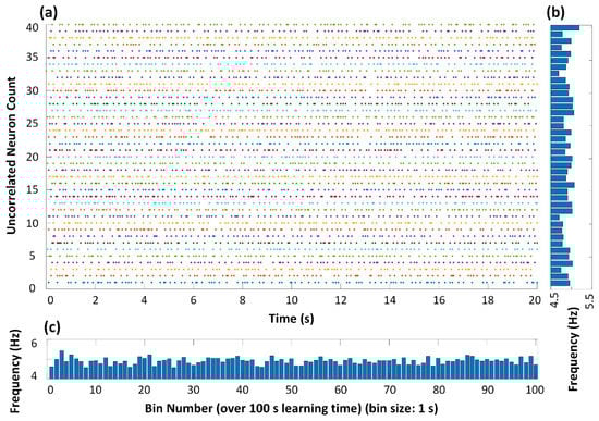 The neural network used for the remaining parts of this study has 100 pre-synaptic neurons with 60 participating (firing mutually correlated spikes) and 40 non-participating (firing Poisson distributed uncorrelated spikes) afferents. Figure 5 shows the spiking characteristics of the 40 uncorrelated/non-participating pre-synaptic afferents individually and collectively over time. Figure 5a represents the firing times of the 40 uncorrelated afferents for the first 20 s of the simulation. The random ISI distribution is notable. Figure 5b shows the random distribution of firing frequency for each of the 40 uncorrelated afferents with a mean of 5 Hz. Figure 5c captures the population firing rate of all 40 non-participating neurons over the full 100 s stimulation. In this case, frequency is measured in 1 s increments (bin size).