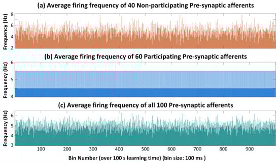 Figure 6 presents the firing frequency of the network over 100 s of simulation. In this case, the population firing rate is measured over reduced 100 ms bins to observe a finer distribution. The 40 non-participating afferents in Figure 6a show random frequency distribution as they are firing Poisson distributed noise. On the other hand, the frequency distribution of 60 participating afferents in Figure 6b is not random, as they are firing mutually correlated spikes at 5 Hz, although at different times relative to the start of each pattern presentation window. Figure 6c shows the population frequency distribution of the whole network over 100 s of the simulation in 100 ms time bins. These data demonstrate that there are no instances of very high afferent population firing rate that would cause overexcitation of the output neuron. It can be noted that, on average, all afferents (participating and non-participating) are firing at the rate of 5 Hz.