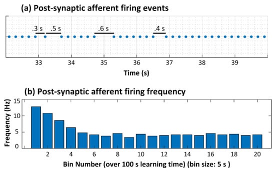 Figure 7 shows the response of the post-synaptic LIF neuron during the 100 s learning period. As can be seen in Figure 7a, the post-synaptic neuron is firing periodically every 0.2 s (200 ms) after 30 s, except a few misses which result in 0.3 s, 0.5 s, and 0.6 s intervals. Figure 7b shows the frequency response over 100 s of simulation with a bin size of 5 s. Initially, the post-synaptic LIF neuron was overexcited due to high equivalent synaptic conductance (strong weights), but stabilized over time to approximately 5 Hz as the network suppresses connections of non-participating afferents.