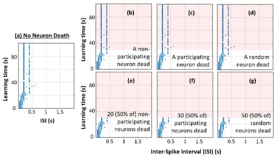 One way to examine differences in network response to neuron failure is to examine the inter-spike interval (ISI) of the output (post-synaptic) neuron versus time. Figure 8a shows the ISI produced by the post-synaptic neuron in the case when no neuron death occurs. After 30 s of training, the ISI is essentially always a multiple of 200 ms, at either 0.2 s or 0.4 s. The latter case is indicative of the output neuron failing to respond during a pattern interval, and could be improved by further tuning and training of the network. Figure 8b,c shows the output ISI over time when one neuron fails in the non-participating and participating groups, respectively. Figure 8d shows a failure of a single neuron occurring from either the participating or non-participating (referred to as combined) groups. After 30 s, the ISI is still approximately 0.2 s or 0.4 s in each of the cases, and almost no change is the pattern learning behavior of the network is observed. However, Figure 8e–g presents the output ISI over time when 50% of randomly selected afferents fail simultaneously at 30 s in the non-participating, participating, and combined groups. After the neuron death at 30 s, no spiking in the post-synaptic neuron is observed and the network was not able to learn the pattern in any of the cases, which is a catastrophic outcome.