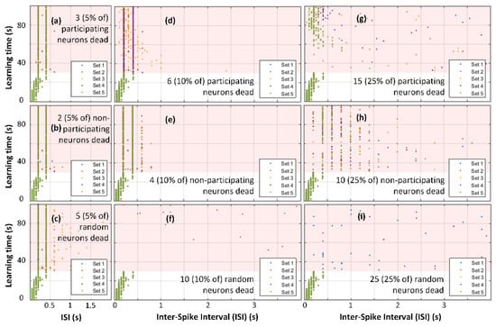 The same situation in Figure 8 was simulated five total times with each simulation having a different set of randomly selected afferents disabled (set 1 to set 5) while the input spiking patterns were kept the same. Figure 9a–c shows the ISI over time when 5% afferents in each of the participating, non-participating, and combined groups failed simultaneously at 30 s. Interestingly, failure of either participating and non-participating neurons by themselves did not significantly destabilize the system, as shown in Figure 9a,b. However, network instability is notable in Figure 9c in which neurons from both participating and non-participating groups were eliminated. This is observable in the scatter of the ISIs up to much higher values than 0.2 or 0.4 s. Figure 9d–f shows the ISI over time when 10% of the afferents in the participating, non-participating, and combined groups failed. It is observed in Figure 9e, perhaps unsurprisingly, that non-participating afferent death keeps the system relatively stable. In the case of random neuron death shown in Figure 9f, after 30 s, the post-synaptic neuron is not learning the pattern and the system becomes unstable, as the ISI is again randomly distributed with overall large values. Similarly, Figure 9g–i shows the ISI of a post-synaptic neuron when 25% pre-synaptic neurons in the participating, non-participating, and combined groups failed. Random combined neuron death shows the most instability in this case, as well.