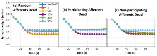 Figure 10 shows the normalized average synaptic weight evolution of all the 100 synaptic memristors in the network. Deviation of weights can be observed in the case of random afferent failure Figure 10a) as the 10%, 25%, and 50% failure rates all show deviation from the no-death case. For participating afferent failure Figure 10b), the 25% and 50% failure rates exhibit significant deviation from the no-death case. Finally, non-participating afferent death (Figure 10c) seems to destabilize the system least. In this case, both the 25% and 50% failure rates deviate initially, but the 25% case evolves back towards the no-death situation as the system regains stability (with continued training via presentation of the patterns).