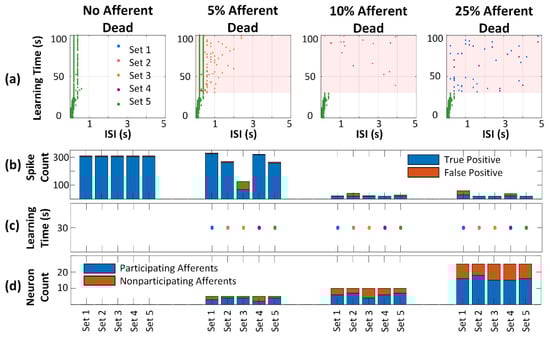 Figure 11 shows the analysis of the network when random neurons from the entire population die simultaneously after 30 s of learning. Figure 11a presents the post-synaptic neuron ISI over time, with the left frame looking identical to Figure 8a. As expected, the network quickly loses pattern recognition capability as the % of dead neurons increases, and even struggles in the 5% death case. Figure 11b presents the number of true positive and false positives recognized by the network. The network stops recognizing the pattern and the post-synaptic neuron stops firing almost entirely at 10% afferent death. Interestingly, set 3 in the 5% death case in Figure 11b also shows significant impact, where the other cases maintain a reasonable level of output neuron firing. Figure 11c shows the time of death for the randomly selected afferents. Finally, Figure 11d shows the distribution of dead participating and non-participating afferents in each of the five sets in each case.
