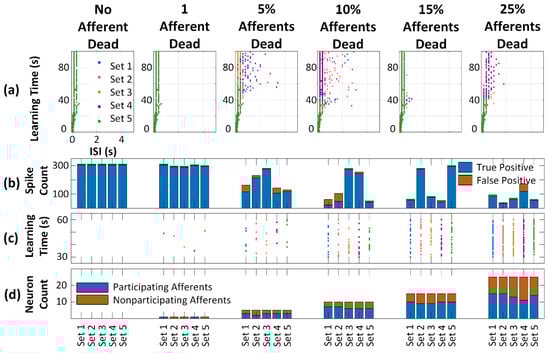 (a) Post-synaptic neuron ISI over time when all afferent death occurs simultaneously at 30 s. As the % of dead neurons increases, the network loses the pattern recognition capabilities. (b) The number of true positive and false positives recognized by the network; the network stops recognizing the pattern and post-synaptic neuron stops firing as neuron death increases. (c) All afferents are dead instantaneously at 30 s. (d) The distribution of dead participating and non-participating afferents in each of the five sets in each case.