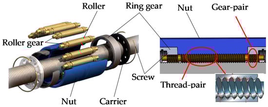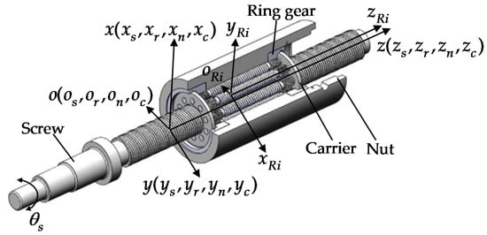 With the development of equipment automation and intelligence and the wide application of electromechanical actuator in industrial fields, electromechanical servo actuation system is developing in the direction of high power, high integration, high precision and high reliability. As an actuator that converts rotational motion into linear motion [1], the planetary roller screw mechanism (PRSM) has gradually become one of the best choices of the electromechanical servo actuation system because of its high load capacity, long service life and convenient installation and maintenance. PRSM mainly transmits power and motion through point contact between threaded teeth. The motion relationship of the components in the standard PRSM is called forward transmission, that is, the screw rotates around its axis, and the nut, as the output component, moves back and forth along the axis. As shown in Figure 1, this is the structure of a standard PRSM, which is mainly composed of screw, nut, roller, ring gear and carrier. The specific structure is that the screw and the nut are processed as multi-starts; the thread on roller is manufactured as a single start. Rollers will participate in the meshing of two types of meshing pairs (thread pair and gear pair) at the same time and are evenly distributed around the screw by the carrier, and the motion is transmitted to the nut through the “planetary motion” of the roller. The carrier does not participate in any meshing motion, and its moving position is controlled by the spring retainer.