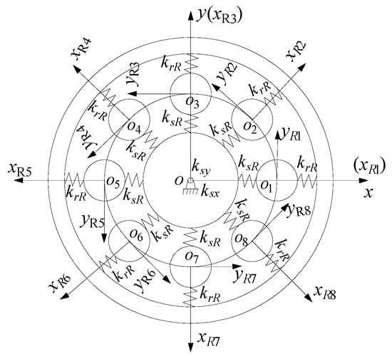 where N is the number of rollers; ms, mr, mn, mRi represent the mass of the screw, ring gear, nut and roller, and meq,s, meq,r, meq,n, meq,Ri are their equivalent mass, respectively. Kjq (j = s, r, n, Ri, c) (q = x, y) (i = 1, 2, …, N) is the bending stiffness; Kju is the torsional stiffness; KjRi is the meshing stiffness between the component and the i-th roller; uj (j = s, r, n, Ri, c) is the tangential displacement; Jc and rc are the moment of inertia and nominal radius of the carrier.
